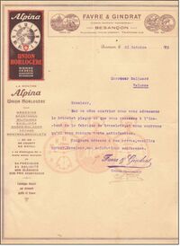 Die Uhrenfabrik Gindrat-Vuile befand sich an zwei Adressen in Besançon. Zuerst in der Rue de la Mouillère 5, dann zog sie in die Avenue Denfert-Rochereau 1 um. Auf den Briefköpfen des Unternehmens ist vermerkt, dass der Firmenname ursprünglich Favre & Gindrat lautete. In den Jahren, als Union Horlogère mit der Marke Alpina warb und Niederlassungen in Bienne, Genève und Besançon hatte, war Gindrat-Vuille der Vertreter von Union Horlogère in Frankreich. Die vertretung wurde auch dann fortgesetzt, als Werbung mit Biel, Glashütte und Besançon gemacht wurde. Es lässt sich nicht genau sagen, von wann bis wann dies der Fall war, aber es muss um 1909 begonnen und mit der Schließung der "Präcisions-Uhrenfabrik Alpina Glashütte GmbH" an diesem Standort geendet haben. Ob die Firma Gindrat-Vuille weiterhin Union Horlogère in Besançon vertrat, ist unklar. Möglicherweise haben sie sich aufgrund des Ersten Weltkriegs bereits aus der Zusammenarbeit zurückgezogen, da das Werk in Glashütte dem Feind gehörte.