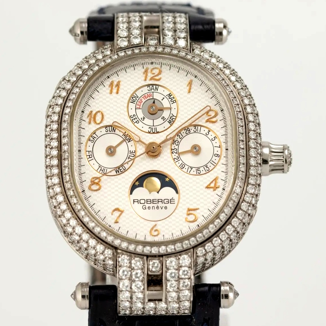 (Robergé Andromède II - Quantième perpétuel ca. 2010 {{Bildrechte U|Auktionen Dr. H. Crott}} {{Kategorie Bildgalerie Uhrenmodelle Robergé}} Außergewöhnliche, charismatische Armbanduhr mit Diamantbesatz, ewigem Kalender und Mondphase. Ref. 10112320. Gehäuse 18 kt Weißgold · Diamanten · aufgeschraubter Boden mit Gravur · originales blaues Alligatorlederarmband mit Faltschließe. Geh.-Nr. 00012. Zifferblatt Versilbert, guillochiert. Automatisch Uhrwerk. Die Uhrenmanufaktur Robergé wurde 1972…) |