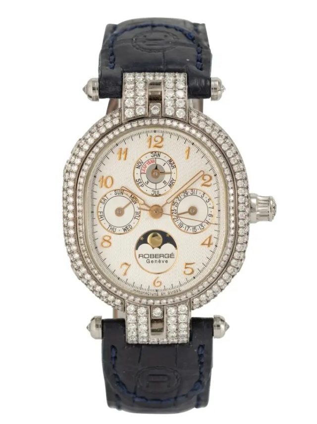 (Robergé Andromède II - Quantième perpétuel ca. 2010 {{Bildrechte U|Auktionen Dr. H. Crott}} {{Kategorie Bildgalerie Uhrenmodelle Robergé}} Außergewöhnliche, charismatische Armbanduhr mit Diamantbesatz, ewigem Kalender und Mondphase. Ref. 10112320. Gehäuse 18 kt Weißgold · Diamanten · aufgeschraubter Boden mit Gravur · originales blaues Alligatorlederarmband mit Faltschließe. Geh.-Nr. 00012. Zifferblatt Versilbert, guillochiert. Automatisch Uhrwerk. Die Uhrenmanufaktur Robergé wurde 1972…) |