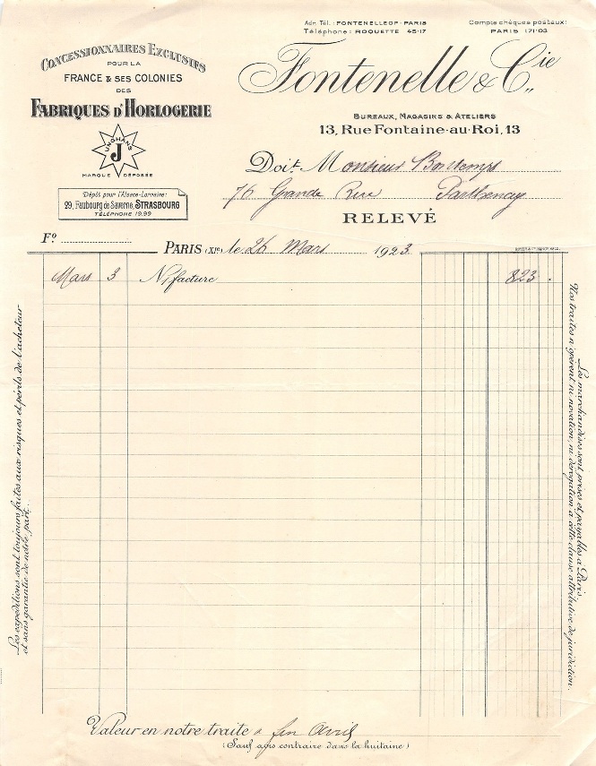 | 15:24, 15. Dez. 2025 | Rechnung Fontenelle & Cie - Junghans, - Paris 1923.jpg (Datei) | 182 KB | Andriessen (Diskussion | Beiträge) | Rechnung Fontenelle & Cie - Junghans, - Paris 1923. ==Lizenz== E-Bay Uhrheber Unbekannt {{Kategorie Bildgalerie Archiv Bontemps à Parthenay}} | 1 | |