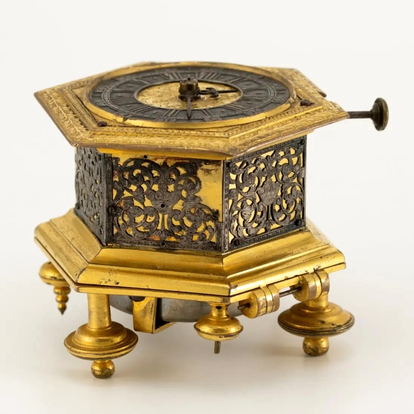 An hexagonal Eychstätt horizontal table clock with quarter-hour repeater in original leather case with viewing window. Case Firegilt brass case · profiled · the walls with screwed-on · openwork decorative grilles with acanthus and fruit basket motifs · long pusher for repetition at "11" · 3 baluster feet and 3 ornamental baluster feet · rear bell. Dial Brass, firegilt, engraved foliage decoration on the edge, applied silver chapter ring with Roman hours and Arabic minutes, gilt centre with engraved acanthus scrolls, blued steel hands. Hexagonal brass movement, firegilt, applied floral decorations, chain/fusee, two engraved hammers in the shape of grotesque heads, verge escapement, three-arm iron balance, finely decorated, openwork balance cock with birds of prey.