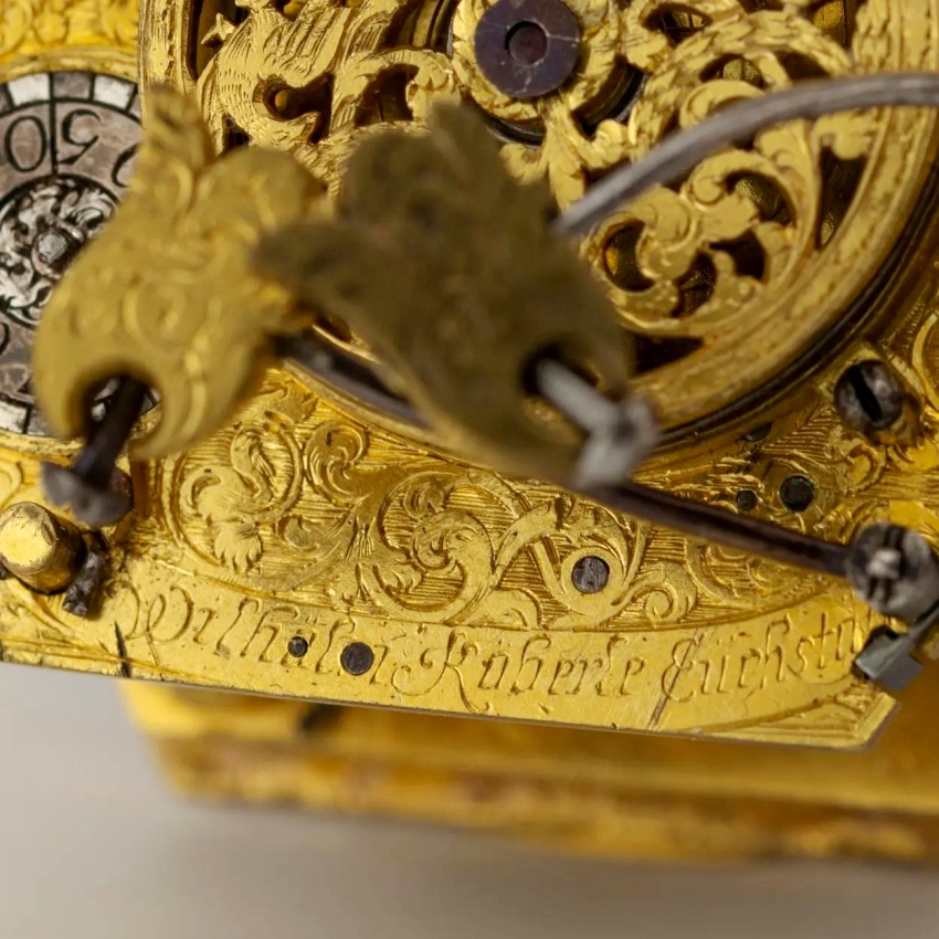 Gehäuse Feuervergoldetes Messinggehäuse · profiliert · die Wandungen mit aufgeschraubten · durchbrochen gearbeiteten silbernen Ziergittern mit Akanthus- und Früchtekorb-Motiven · langer Drücker für die Repetition bei "11" · 3 Balusterfüße und 3 Zier-Balusterfüße · Bodenglocke. Zifferblatt Messing, feuervergoldet, am Rand graviertes Blattrankendekor, aufgelegter silberner Ziffernring mit röm. Stunden und arab. Minuten, vergoldetes Zentrum mit gravierten Akanthusranken, gebläute Stahlzeiger. Hexagonales Messingwerk, feuervergoldet, aufgelegte florale Zierelemente, Kette/Schnecke, zwei gravierte Hämmer in Form grotesker Köpfe, Spindelhemmung, dreiarmige Eisenunruh, feinst verzierter, durchbrochen gearbeiteter Unruhkloben mit Greifvögeln.