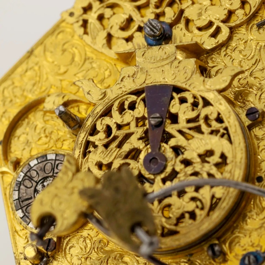 Gehäuse Feuervergoldetes Messinggehäuse · profiliert · die Wandungen mit aufgeschraubten · durchbrochen gearbeiteten silbernen Ziergittern mit Akanthus- und Früchtekorb-Motiven · langer Drücker für die Repetition bei "11" · 3 Balusterfüße und 3 Zier-Balusterfüße · Bodenglocke. Zifferblatt Messing, feuervergoldet, am Rand graviertes Blattrankendekor, aufgelegter silberner Ziffernring mit röm. Stunden und arab. Minuten, vergoldetes Zentrum mit gravierten Akanthusranken, gebläute Stahlzeiger. Hexagonales Messingwerk, feuervergoldet, aufgelegte florale Zierelemente, Kette/Schnecke, zwei gravierte Hämmer in Form grotesker Köpfe, Spindelhemmung, dreiarmige Eisenunruh, feinst verzierter, durchbrochen gearbeiteter Unruhkloben mit Greifvögeln.