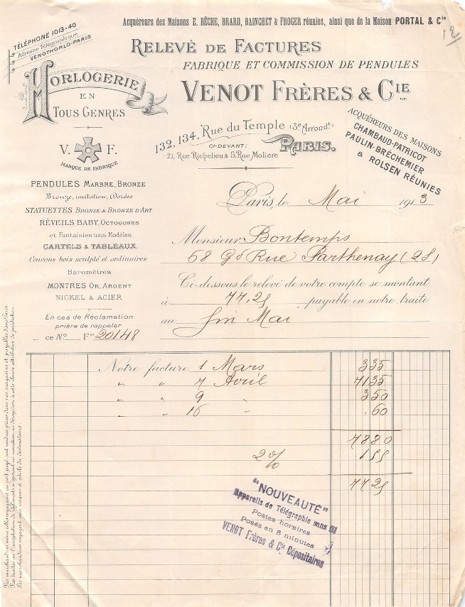 Rechnung Venot Frères & Cie. Paris, 1913.