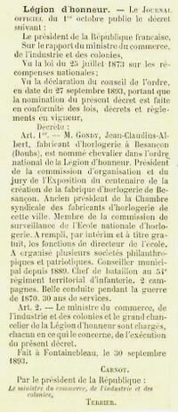 Jean Claudius Albert Gondy wohnte in Besançon in die Villa Sainte Colombe welche sich in der Rue Vieilles-Perrières (diesen Ort anzeigen) befand. Er war ein angesehener Mann in Besançon, er war ab 1889 Stadtrat, von 1896 bis 1898 stellvertreteder Bürgermeister, und von 1898 bis 1901 Bürgermeister. Ausserdem war er ach der "Chef de Battaillion 54e régiment terretorial d'infanterie". Fur die Uhrenindustie war er Präsident der Kommission und Jury der "organisation du centenaire l'Horlogerie" (100 Jahrefeier) in Besançon im jahre 1893, und im Jahre 1900 beim Ausstellung Jurymitglied. Er war Mitglied der Handelskammer, Präsident vom Syndikat "l 'Horlogerie Bisontine". Mitglied der Aufsichtsrat der "Ecole d'Horlogerie" (Uhrmacherschule), und interim Direktor. Direktor der Bulletin "Progrés Francais".
