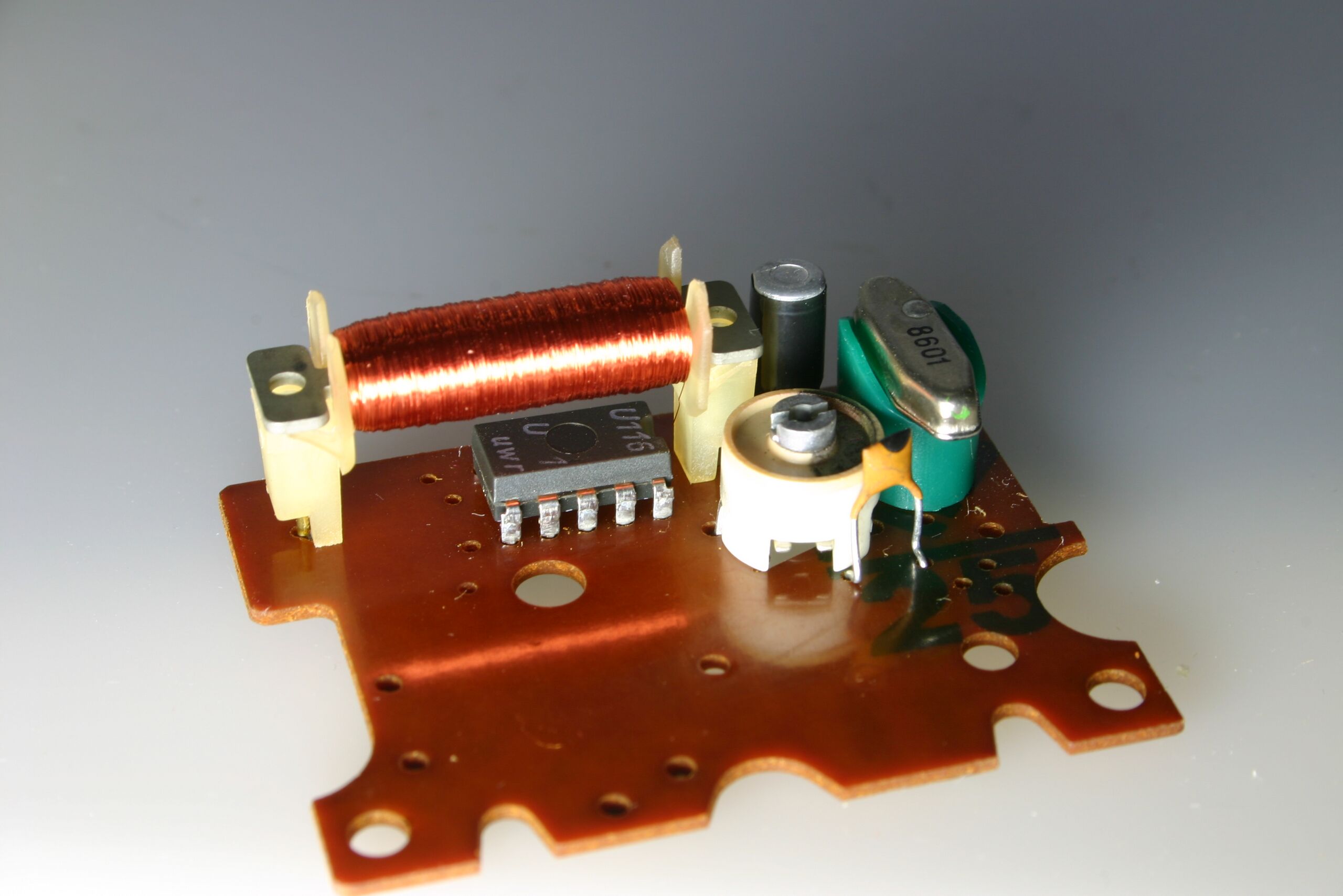 Ruhla Kal.62, Leiterplatte mit aufgelötetem Schaltkreis U116, Trimmer, Spule und Quarz