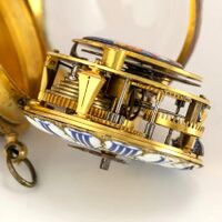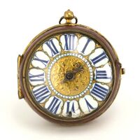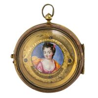 Domaine Burdet, einzeigriges Genfer Oignon mit Emailportrait einer vornehmen Dame auf der Unruhbrücke ca. 1690