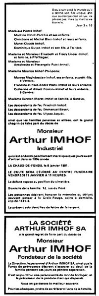 Arthur Imhof starb am 8. Januar 1991 in La Chaux-De-Fonds, 98 Jahre alt.