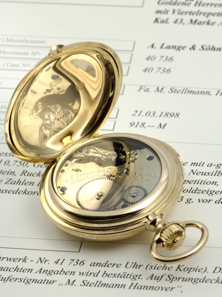 A. Lange & Söhne Glashütte B/Dresden, Movement No. 40736, Case No. 40736, Cal. 43, 54 mm, 153 g, circa 1898. A very fine, heavy Glashuette quarter repeating hunting case pocket watch - sold on 03/21/1898 for the sum of 907 Marks to M. Stellmann company in Hannover - manufactured in quality 1A - with Lange extract from the archives. Case: 18k rose gold, glazed movement. Dial: enamel. Movm.: 3/4 plate movement, 2 hammers / 2 gongs, gold screw compensation balance.