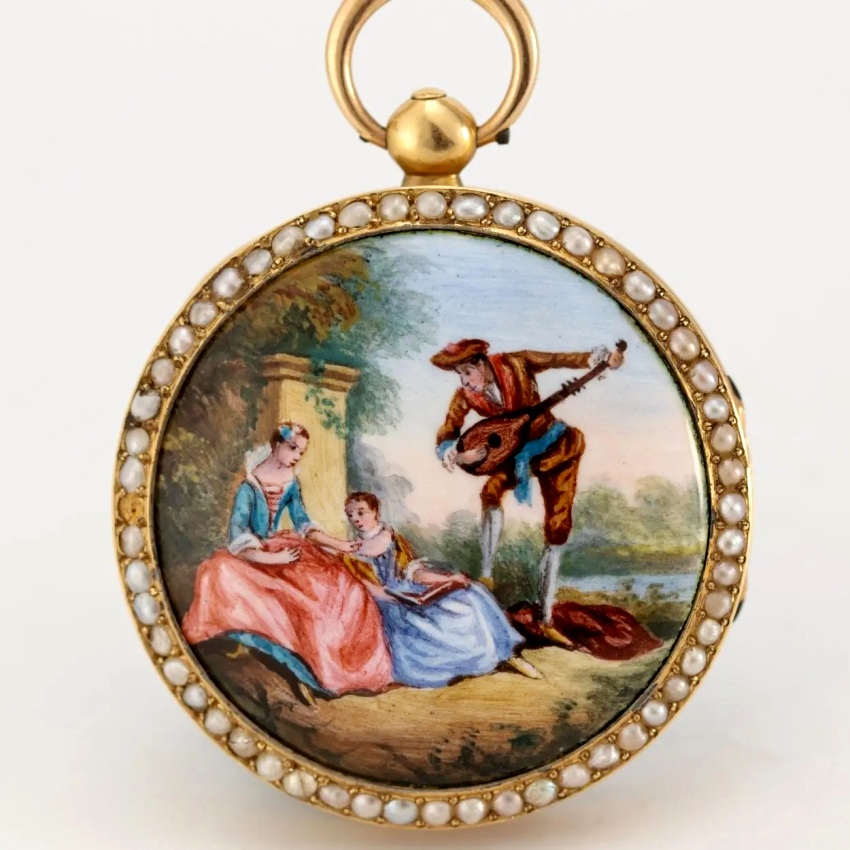 Genfer Goldemail-Spindeltaschenuhr, Bordier, Galante Szene. Gehäuse 18 kt Gold, halbperlenbesetzte Lunetten, rückseitig mit Email-Miniaturmalerei einer galanten Szene. Geh.-Nr. 3690. Email Zifferblatt. Vollplatinenwerk, Kette/Schnecke, dreiarmige Messingunruh.