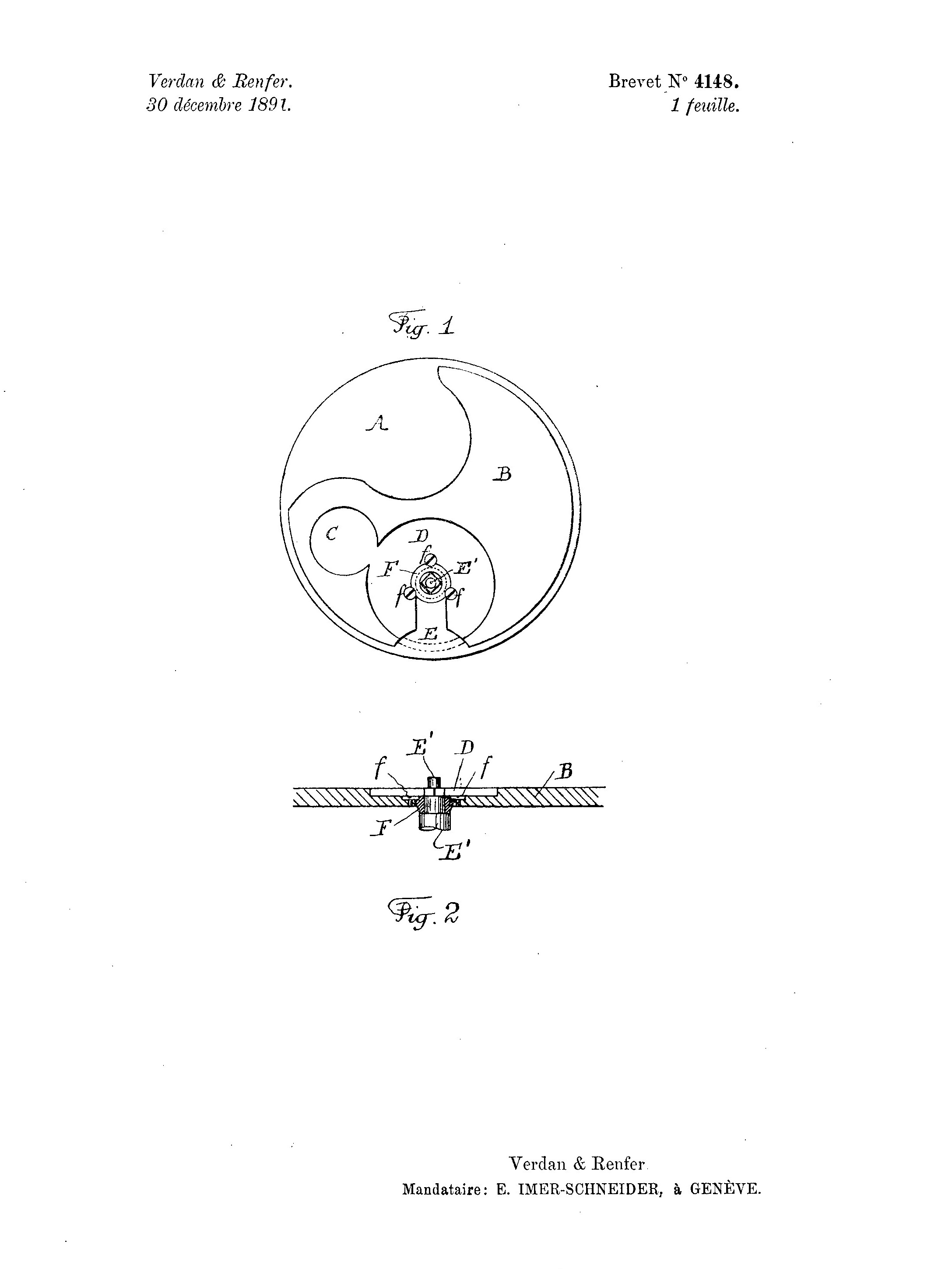 Brèvet Nr. 4148 Verdan & Renfer 30. Dezember 1891