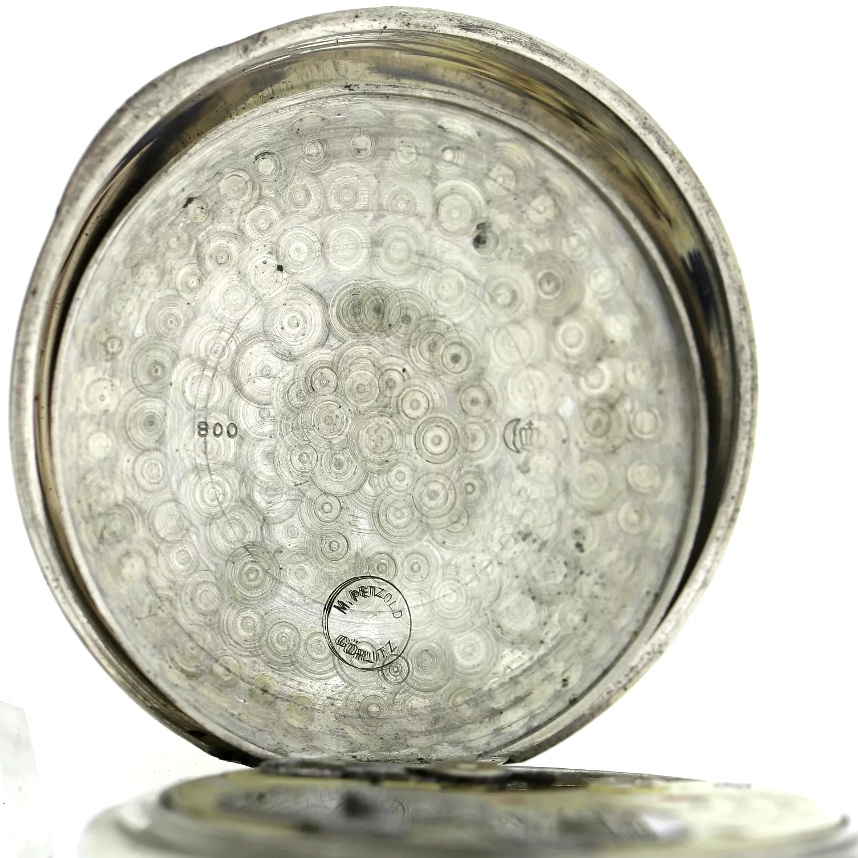 Geh.: Silber, glatt, Silbercuvette. Ziffbl.: Email, arab. Zahlen, eingesetzte kleine Sekunde, signiert, gebläute Spade-Zeiger. Werk: 3/4-Platinenwerk, gekörnt, vergoldet, signiert, verschraubte Goldchatons, polierte Schrauben, Goldschrauben-Komp.-Unruh, fein gravierter Unruh- und Ankerkloben, Rückerfeder-Feinregulierung, Goldanker und -ankerrad, goldchatonierter Rubindeckstein auf Anker und Ankerrad.