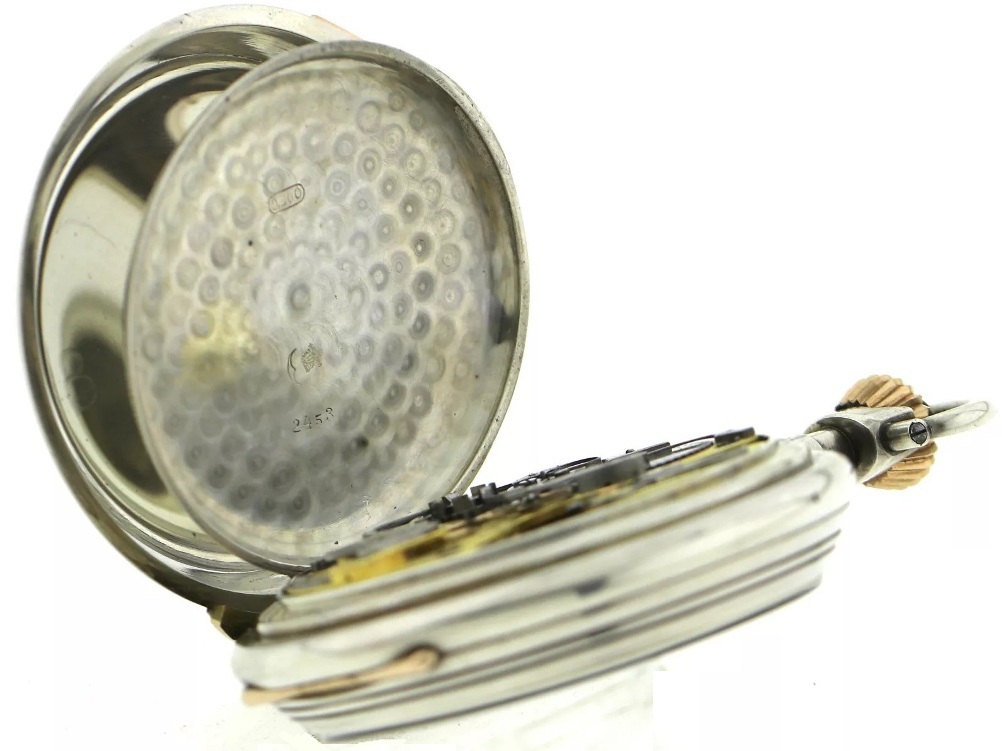 Gehäuse: 900er/ Silber mit goldenen Außenscharnieren, hier ungewöhlicher Weise auf der rechten Seite, sonnenstrahl Muster mit leerer Monogramm Kartusche, minimale, oberflächliche Nutzungsspuren, siehe Bilder, Durchmesser 57mm, Basis A. Lange & Söhne.