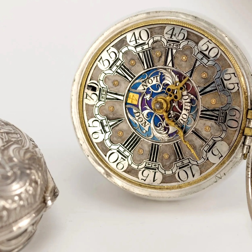 The repoussé outer case is signed "D Cochin F" and was made by renowned repoussé artist Daniel Cochin, who worked as medalist, engraver and maker of repoussé watch cases from 1732 to 1768. Cochin was born in Geneva and lived in Vitry/Champagne. He is regarded as one of the best makers when it came to repoussé art. His magnificent pieces stand out from other work due to his abundant use of many figures. Cochin is connected to the cases of a series of Dutch style continental fakes of English timepieces, produced in the second half of the 18thcentury.
