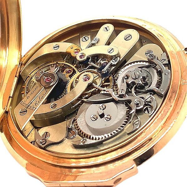 Gehäuse 18 kt Roségold, monogrammiert, Werksverglasung. Email Zifferblatt. Brückenwerk, außergewöhnlicher, früher Chronographenmechanismus mit Wippenantrieb und Sternrad über dem Ankerrad, Kolbenzahn-Ankerhemmung, drei gebläute Unruhspiralen, Schrauben-Komp.-Unruh. Geh.-Nr. 12169.