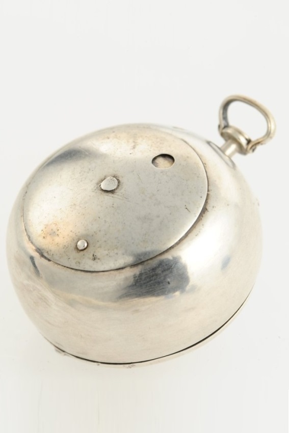 A rare one-handed verge pocket watch with date Case: silver, polished. Dial: silver, Champlevé style, radial Roman numerals, date window, gilt engraved hand. Movm.: full plate movement, keywind, firegilt, signed, chain/fusee, Egyptian movement pillars, "mock pendulum balance", fine florally engraved balance cock.