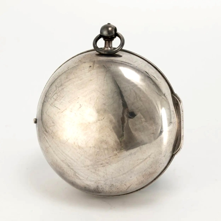 Gehäuse Silber · glatt. Zifferblatt Feuervergoldet, ziseliert und graviert, Emailkartuschen mit schwarzen radialen röm. Zahlen. Werk Vollplatinenwerk, Kette/Schnecke, vierarmige Messingunruh. Dieses feine französische Oignon verfügt über ein vergoldetes Uhrwerk mit Balusterpfeilern. Kette/Schnecke und Räderwerk befinden sich zwischen den Platinen. Ein Kloben, der mit Ranken, Vögeln und Muschelwerk reich verziert ist, schützt die vierarmige Messingunruh. Das Zifferblatt ist im Zentrum gleichermaßen verziert. Schwarze Emailkartuschen und ein einzelner, schön gearbeiteter Zeiger zeigen die Stunden an.