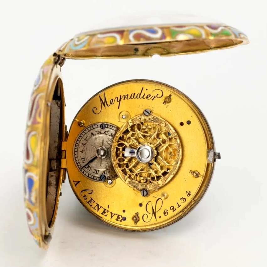 Meynadier, Dekorative Genfer Goldemail-Spindeltaschenuhr, Werknr. 62134, ca. 1830.