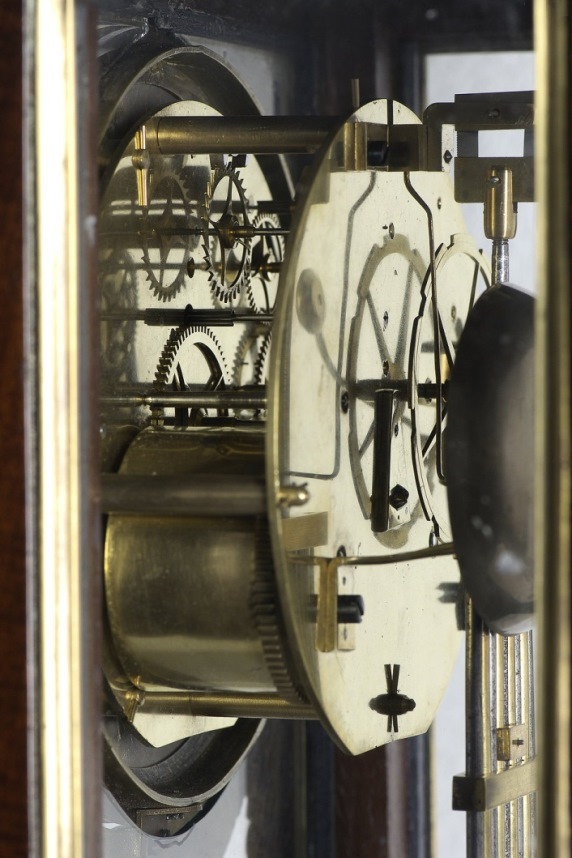 Case: mahogany, upright rectangular case on four gilt feet with engravings; moulded base and cornice with dentil patterned border, lozenge-shaped brass inlay, glass panels on four sides. Bezel surround with ormulu palmette moulding and drapery. Dial: enamel, radial Roman hours, gilt hands. Movm.: circular brass full plate movement, 2 barrels, 1 hammer / 1 bell, solid movement pillars, locking plate, lever escapement, compensation gridiron pendulum with knife edge suspension.