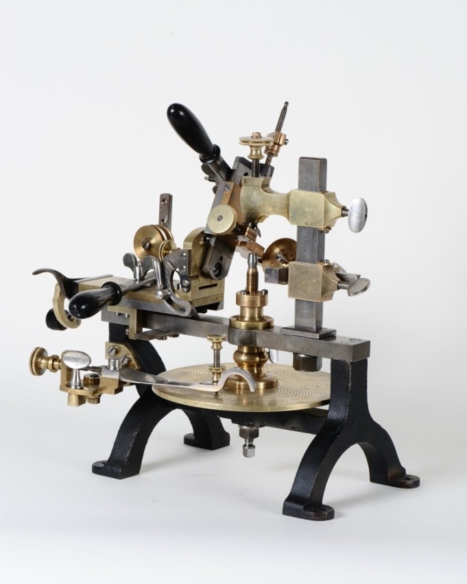 A collection of a Swedish seconds pendulum clock and a machine and accessories for gear cutting that was used to cut the train for this clock Case: fruitwood, glazed front, glazed windows to the sides, undulated pediment with graven coat of arms. Dial: glass, black, hour at "6", radial Roman numerals, seconds at "12", central minute indicator, Breguet hands. Movm.: solid trapezoid-shaped brass movement, solid movement pillars, weight driven, Graham escapement, brass/steel pendulum.