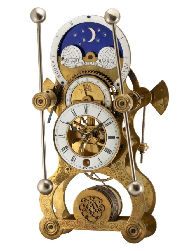 Mr. Harrisons's Moon Phase Sea Clock: An ornamental English 8-day skeleton clock with moon phase and Grasshopper escapement. Case Brass. Dial Enamel chapter rings for hours and auxiliary seconds, hand-painted enamel dial for moon phase, zircons as stars, blued hands. Movemenr Skeletonised arched brass frame, partly engraved, steel rope/fusee, two oscillating dumb-bell pendulums. The unusual seconds hand traverses 240 degrees and moves from 0–60 seconds before disappearing, only to reappear immediately at zero.