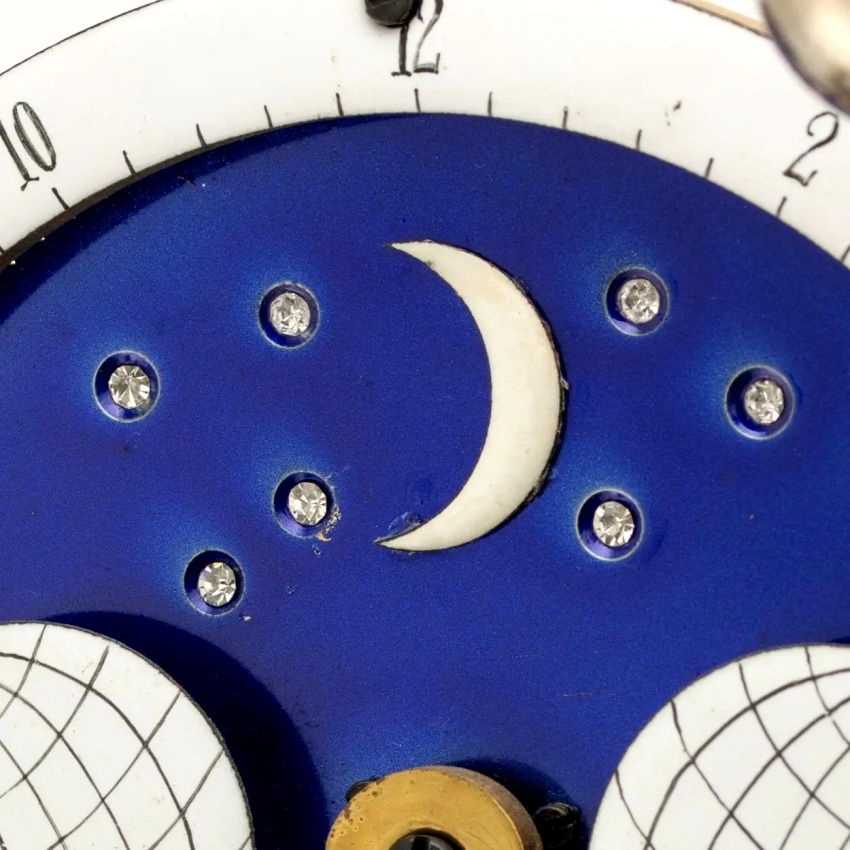 Mr. Harrisons's Moon Phase Sea Clock: An ornamental English 8-day skeleton clock with moon phase and Grasshopper escapement. Case Brass. Dial Enamel chapter rings for hours and auxiliary seconds, hand-painted enamel dial for moon phase, zircons as stars, blued hands. Movemenr Skeletonised arched brass frame, partly engraved, steel rope/fusee, two oscillating dumb-bell pendulums. The unusual seconds hand traverses 240 degrees and moves from 0–60 seconds before disappearing, only to reappear immediately at zero.