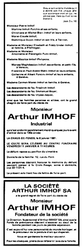 - L'impartial, 9. Januar 1991, Todesanzeige Arthur Imhof.