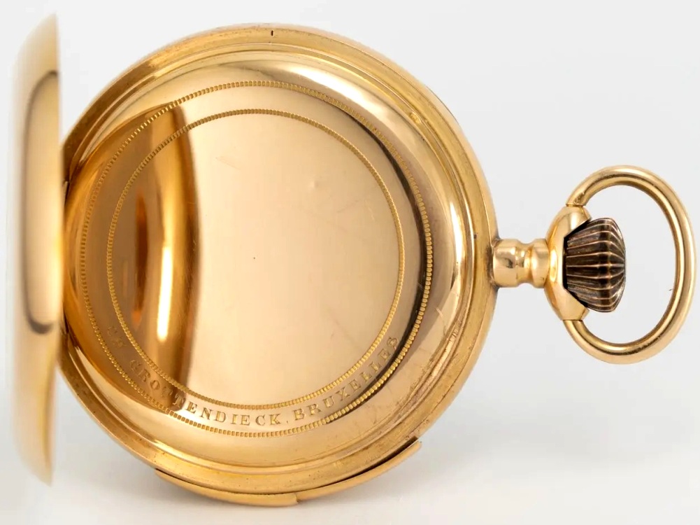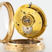 | 20:25, 1. Dez. 2025 | Charles Grottendieck, Dekorative, schwere Taschenuhr mit Minutenrepetition, ca. 1900 (4).jpg (Datei) | 210 KB | Andriessen | Charles Grottendieck, Dekorative, schwere Taschenuhr mit Minutenrepetition, ca. 1900 {{Bildrechte U|dem Auktionshaus Auktionen Dr. H. Crott}} {{Kategorie Bildgalerie Uhrwerke Grottendieck, Charles}} Gehäuse 18 kt Gold · graviertes Monogramm. Geh.-Nr. 1630 Zifferblatt Email, rote 24h-Anzeige. Brückenwerk, 2 Hämmer / 2 Tonfedern, Ankerhemmung, Schrauben-Komp.-Unruh. An ornamental, heavy minute repeating pocket watch. Case 18 K gold · engraved monogram. Case no. 1630. Dial Enamel, red 24h d… | 1 | |