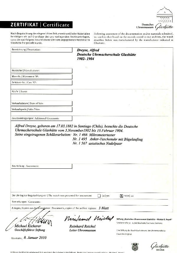 | 11:17, 9. Nov. 2025 | DUS Alfred Dreyse No. 1495 1902-1904 (08).jpg (Datei) | 247 KB | Andriessen | Alfred Dreyse, Santiago Chile, Deutsche Uhrmacherschule Glashütte i/SA, Werk Nr. 1495, 55 mm, 133 gr., circa 1904 {{Bildrechte U|dem Auktionshaus Auktionen Dr. H. Crott}} Seltene, feine Schuluhr - gefertigt an der deutschen Uhrmacherschule Glashütte mit Kopie des Abgangszeugnisses Geh.: Silber, glatt, Silbercuvette. Ziffbl.: Email, arab. Zahlen, eingesetzte kleine Sekunde, signiert, gebläute Spade-Zeiger. Werk: 3/4-Platinenwerk, gekörnt, vergoldet, signiert, verschraubte Goldchatons, p… | 1 | |