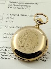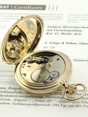 | 11:39, 1. Dez. 2025 | ALS No. 40736 Geh. No. 40736, Max Stellmann circa 1898 (09).jpg (Datei) | 148 KB | Andriessen | == Beschreibung == A. Lange & Söhne No. 40736 Geh. No. 40736, Max Stellmann circa 1898 {{Bildrechte U|dem Auktionshaus Auktionen Dr. H. Crott}} {{Kategorie Bildgalerie Uhrwerke A. Lange & Söhne / Glashütte i. Sa.}} {{Kategorie Bildgalerie Uhrwerke Stellmann Juweliere und Uhrmacher}} A. Lange & Söhne Glashütte B/Dresden, Werk Nr. 40736, Geh. Nr. 40736, Cal. 43, 54 mm, 153 g, circa 1898. Hochfeine, schwere Glashütter Savonnette mit Viertelstundenrepetition - verkauft am 21.03.1898 für 907 M… | 1 | |