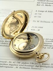 | 11:38, 1. Dez. 2025 | ALS No. 40736 Geh. No. 40736, Max Stellmann circa 1898 (08).jpg (Datei) | 125 KB | Andriessen | == Beschreibung == A. Lange & Söhne No. 40736 Geh. No. 40736, Max Stellmann circa 1898 {{Bildrechte U|dem Auktionshaus Auktionen Dr. H. Crott}} {{Kategorie Bildgalerie Uhrwerke A. Lange & Söhne / Glashütte i. Sa.}} {{Kategorie Bildgalerie Uhrwerke Stellmann Juweliere und Uhrmacher}} A. Lange & Söhne Glashütte B/Dresden, Werk Nr. 40736, Geh. Nr. 40736, Cal. 43, 54 mm, 153 g, circa 1898. Hochfeine, schwere Glashütter Savonnette mit Viertelstundenrepetition - verkauft am 21.03.1898 für 907 M… | 1 | |