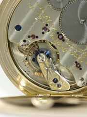 | 21:10, 1. Dez. 2025 | Système Glashütte, Goldene Savonette ca. 1900 (5).jpg (Datei) | 355 KB | Andriessen | System Glashütte , Goldene Savonette ca. 1900 {{Bildrechte U|dem Auktionshaus Auktionen Dr. H. Crott}} {{Kategorie Bildgalerie Uhrwerke System Glashütte}} Gehäuse 14 kt Gold · guillochiert. Geh.-Nr. 86503. Email Zifferblatt. Werk 3/4-Platinenwerk, Ankerhemmung, Schrauben-Komp.-Unruh. A gold hunting case pocket watch "System Glashütte". 14 K gold case · guilloché pattern. Case no. 86503. Enamel Dial. 3/4 plate movement, lever escapement, screw compensation balance. | 1 | |